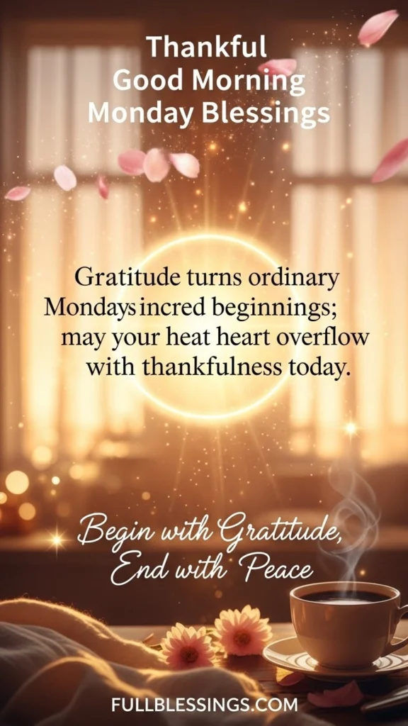 Gratitude turns ordinary Mondays into sacred beginnings; may your heart overflow with thankfulness today.